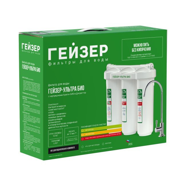 В фильтрах серии Гейзер Ультра БИО применена инновационная технология очистки воды. Сочетание картриджей Арагон 2 БИО и Fiber Pro обеспечивают максимально возможное качество фильтрации, увеличенный ресурс, двойной ресурс по удалению бактерий и вирусов, а также прекрасный вкус чистой воды. Отсутствуют вредные выбросы для людей и окружающей среды.